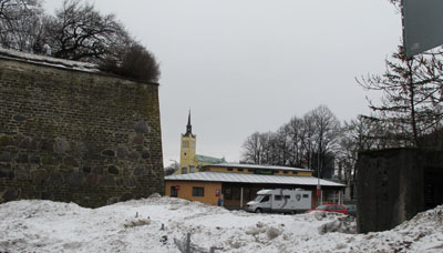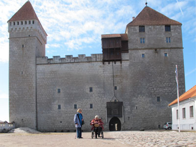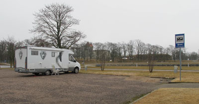 I Kuresaare på Ösel syns vår husbil som en liten vit prick till vänster i bild. Slottet i Kuresaare är till höger. Turistinformationen angav att alla campingar var stängda... |